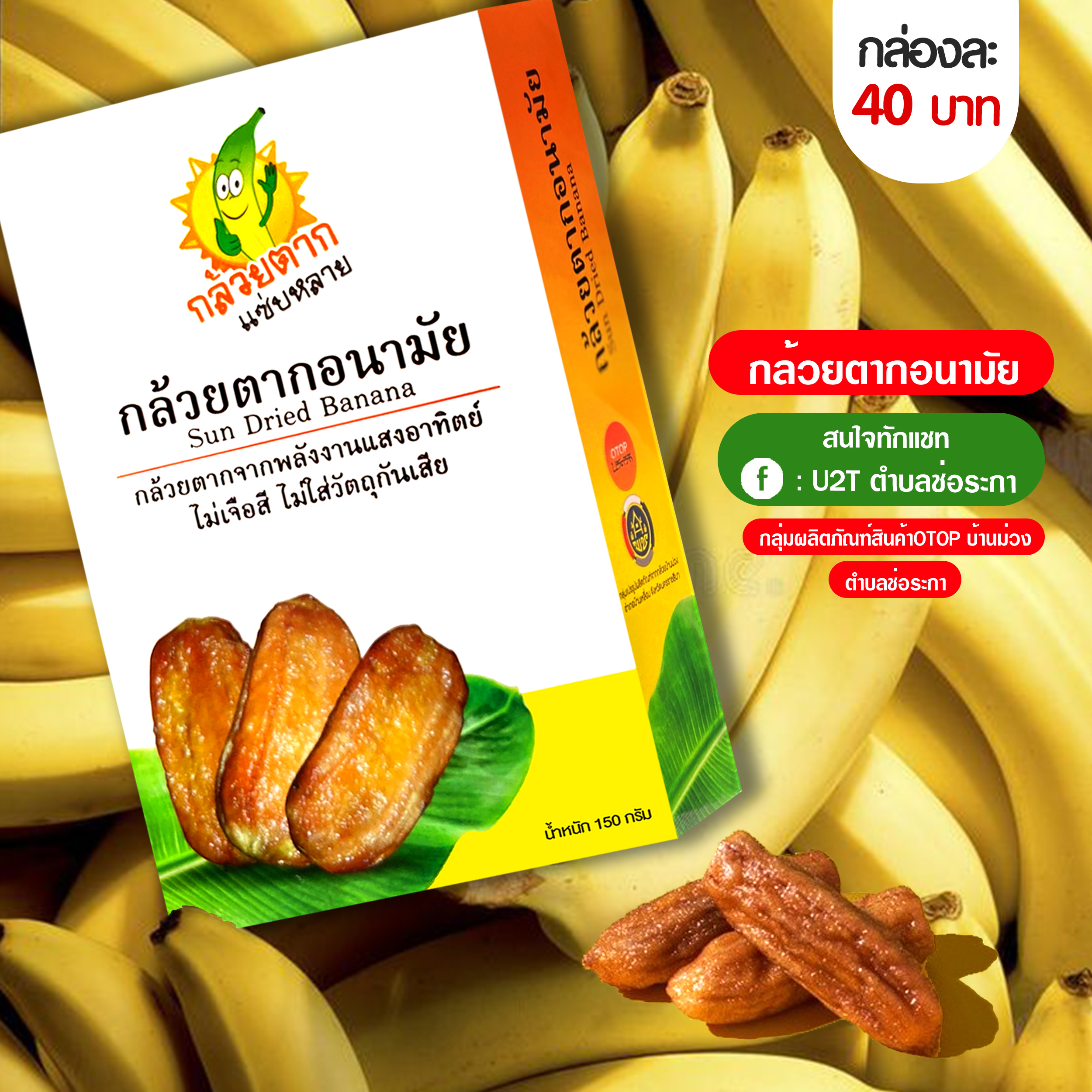 ผลิตภัณฑ์กล้วยตากอนามัย (Sun Dried Banana) จากพลังงานแสงอาทิตย์ เริ่มต้นจากกล้วยน้ำว้าที่มีปริมาณมากในชุมชนบ้านม่วง แล้วคิดหาวิธีที่ทำให้สามารถรับประทานได้นานขึ้น จึงได้จุดเริ่มต้นของกล้วยตากจากที่ทำรับประทานภายในครอบครัวฝากพี่ฟังน้องแจกจ่ายถึงญาติที่อยู่ต่างจังหวัด จนมีแรงบันดาลใจในการผลิตเป็นสินค้าเพื่อออกจำหน่ายในท้องตลาด และนี้เป็นที่มาของกล้วยตากอนามัยของเรานั่นเอง