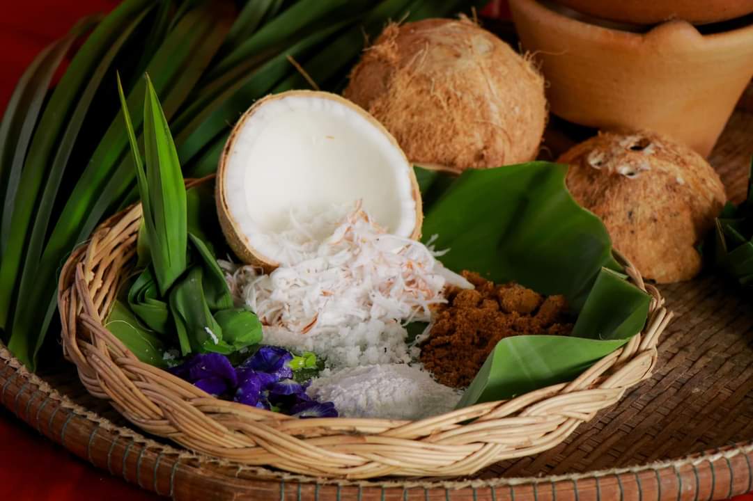 🥥ส่วนผสม ใช้แป้งข้าวเหนียวผสมกับนํ้าตาลทรายแดง (ไม่ฟอกสี) หรือน้ําตาลอ้อยบดผง อาจตัดเกลือเล็กน้อยด้วยก็ได้ แล้วใส่เนื้อมะพร้าวแก่ขูดขุย กับเนื้อมะพร้าวทึนทึกขูดพอหยาบๆ คลุกเคล้าให้เข้ากัน เหตุที่ต้องใช้มะพร้าวทั้งสองแบบ เพราะมะพร้าวแก่ช่วยให้ความมันกับเนื้อขนม ส่วนมะพร้าวทึนทึกช่วยให้ขนมนุ่มขึ้น ไม่เหนียว หรือแข็งเกินไป จากนั้นตักแป้งผสมใส่ลงใน 'เนียล' ที่วางบนหม้อนึ่งข้าวใอ่น้ำผ่านรูตรงก้นกะลาขึ้นมา ทําให้ขนมสุก ปิดฝาพักไว้ประมาณ 2-3 นาทีหรืออาจมากกว่านั้น ขึ้นอยู่กับความหนาของแป้งที่ตักใส่ลงไป พอแป้งขนมสุกดีแล้ว จะได้เนื้อขนมเนียลสีนํ้าตาลอ่อน หอมกลิ่นมะพร้าว เนื้อเหนียวหนึบ กินตอนร้อนๆ ได้รสหวาน มัน กลมกล่อม เป็นขนมพื้นบ้านถิ่นอีสานใต้อย่างหนึ่งที่น่าลิ้มลองและหากินได้ยากในปัจจุบัน